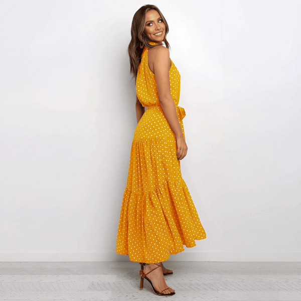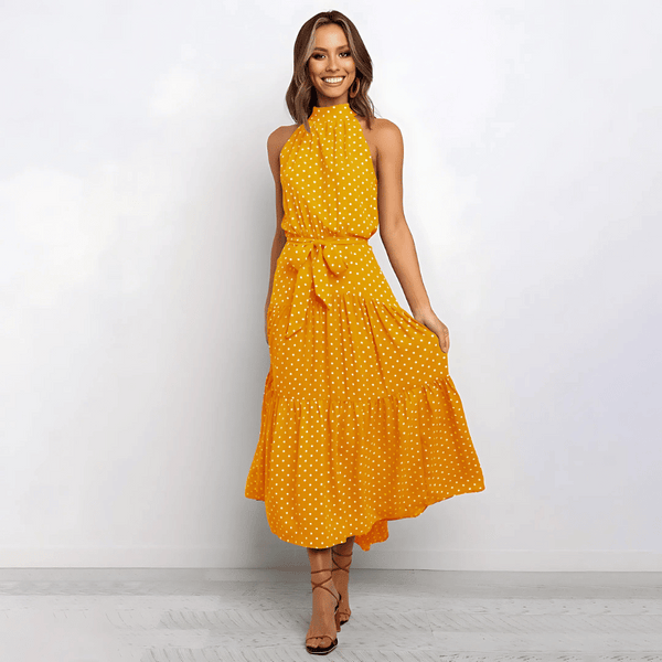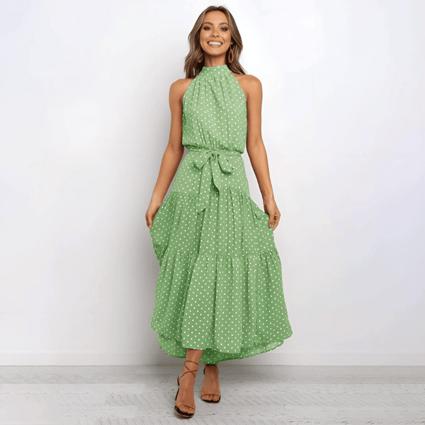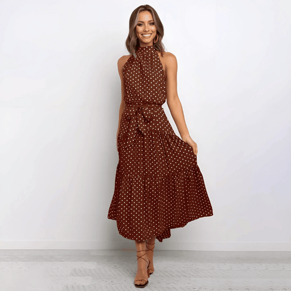 Denna vackra halterneck maxiklänning är designad för kvinnor som vill förena elegans med avslappnad stil. Klänningen har en smickrande silhuett och charmiga prickar, vilket gör den perfekt för alla tillfällen, så att du alltid strålar av stil.