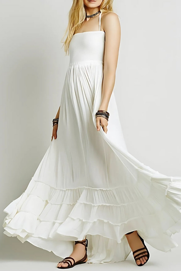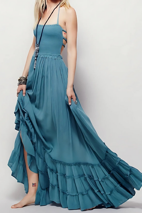 Denna väldesignade maxiklänning förenar en smickrande halterneck med en öppen rygg, vilket ger en kombination av stil och avslappning för kvinnor. Tillverkad av lättviktigt material, faller klänningen vackert och gör den perfekt för sommardagars aktiviteter och speciella tillfällen.