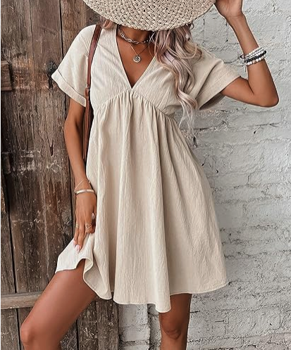 This beige mini dress with a textured finish and deep v-neckline offers a charming combination of style and simplicity for any occasion. For women looking for a versatile dress to refresh their wardrobe, this dress promises ease of use and casual elegance.
